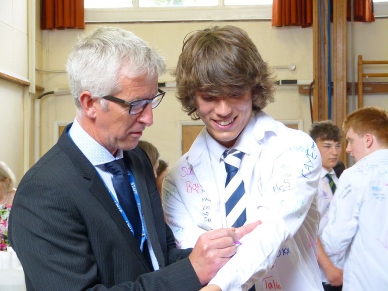 Students were then treated to a celebratory lunch, before the traditional shirt signing began! We will miss their daily presence in school and would like to wish all our Year 11s the best of luck in their exams. Pictured is Headteacher Mr Prosser signing Will’s shirt.